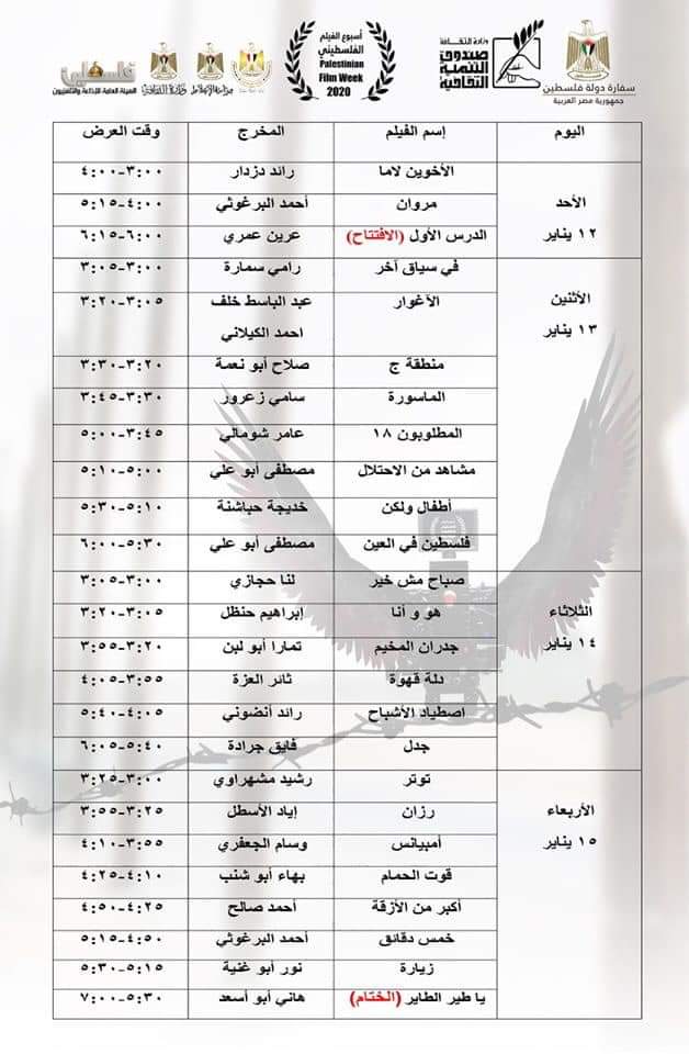 يتضمن جدول عروض الأفلام التي تبدأ من الثالثة عصرا يوميا وحتى السابعة مساءً كل من فيلم (تـوتـر) رشيد مشهراوي، (خمس دقائق) لأحمد البرغوثي، (قوت الحمام) لبهاء أبو شنب ، (أكبر من الأزقة) لأحمد صالح ، (جــدل) لفايق جرادة ، (رزان أثر الفراشة) إياد الأسطل ، (زيارة) نور أبو غنية ، (الأخوين لاما) رائد دزدار،(مروان) أحمد البرغوثي ، (في سياق آخر) رامي سمارة ـ معن ياسين ،(الأغوار) عبد الباسط خلف ـ أحمد كيلاني ، (اصطياد الأشباح) رائد أنضوني ، (فلسطين في العين) مصطفى أبو علي ، (جدران المخيم) تمارا أبو لبن ، (صباح مش خير) لنا حجازي ، (هو و أنا) إبراهيم حنظل ،(دلــة قهوة) ثائر العزة ،(المطلوبون 18) عامر شومالي ،(الماسورة) سامي زعرور، (مشاهد من الاحتلال في غزة) مصطفى أبو علي ، (أطفال ولكن) خديجة حباشنة ، (منطقة ج ) صلاح أبو نعمة ، (أمبيانس) وسام الجعفري ، ويشهد ختام الأسبوع عرض فيلم ( ياطير الطاير) لهاني أبو أسعد .