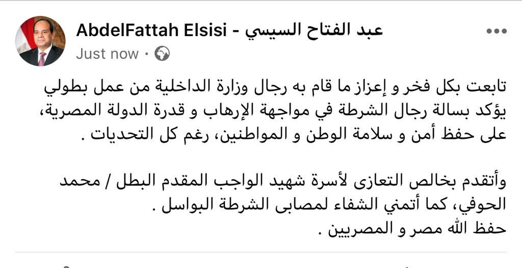 وتقدم الرئيس، فى منشور على صفحته الرسمية بفيس بوك بخالص التعازى لأسرة شهيد الواجب المقدم البطل / محمد الحوفى، كما أتمنى الشفاء لمصابى الشرطة البواسل .