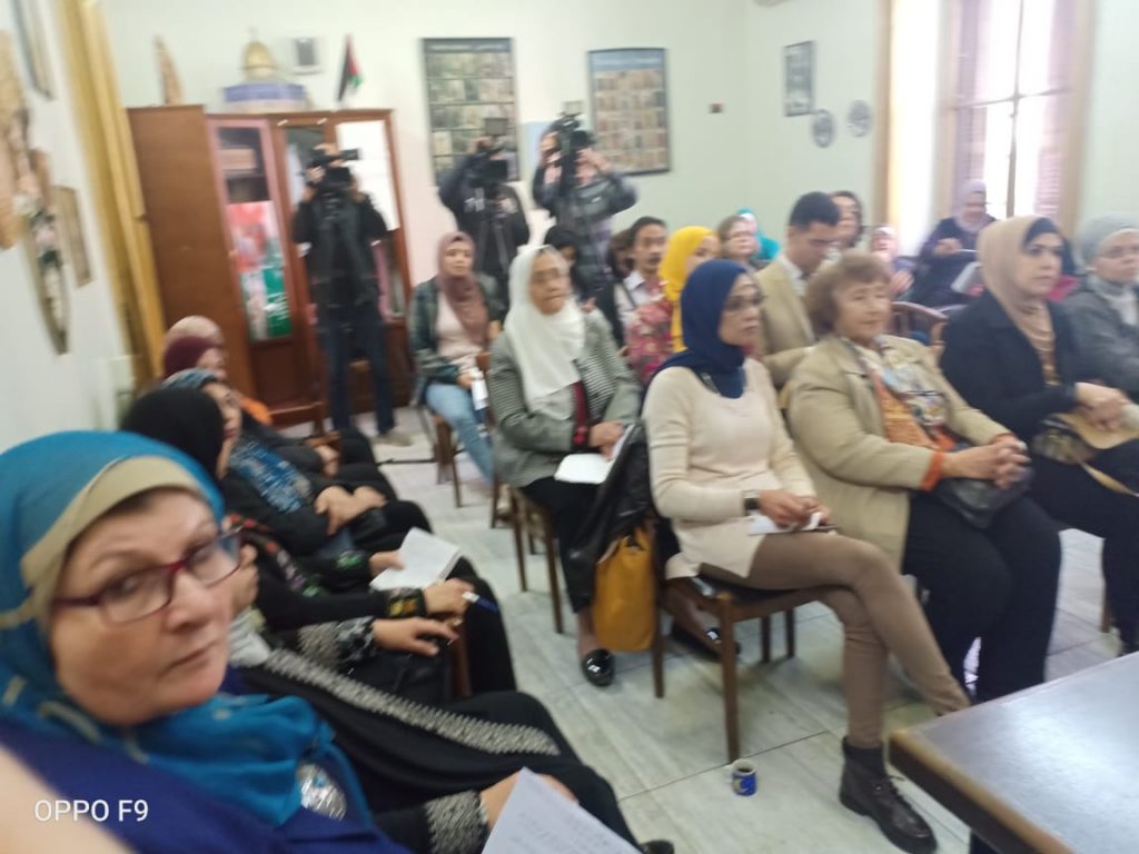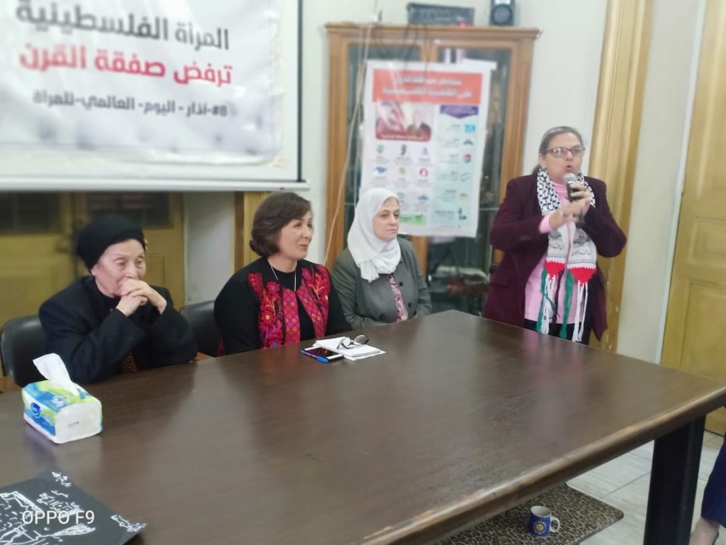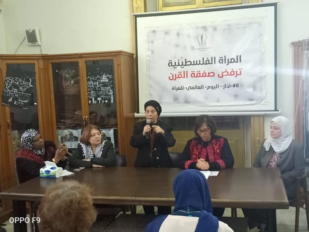 قدمت السيدة عبلة الدجانى رئيسة الاتحاد نبذة عن صفقة القرن ومخاطرها، وشددت على رفض الاتحاد لهذه الصفقة، واشادت بنضال المرأة الفلسطينية عبر التاريخ، وفي مقدمته النضال العسكري والسياسي، الذي تجسد في أكثر من شخصية مناضلة فلسطينية عن رموز الصمود والقوة.