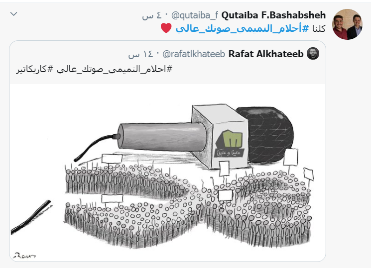 وسرعان ما أشعل مقطع الفيديو موجة واسعة من التضامن مع الأسيرة المحررة أحلام التميمي التي كانت قد عادت إلى الأردن بعد إطلاقها من سجون الاحتلال في العام 2011 ضمن صفقة تبادل “وفاء الأحرار” كما اشتعلت موجة غير مسبوقة من الغضب تجاه قرار الحكومة إبعاد نزار التميمي وهو زوج المواطنة الأردنية أحلام عن البلاد.