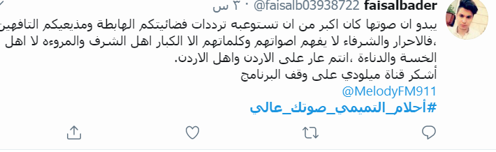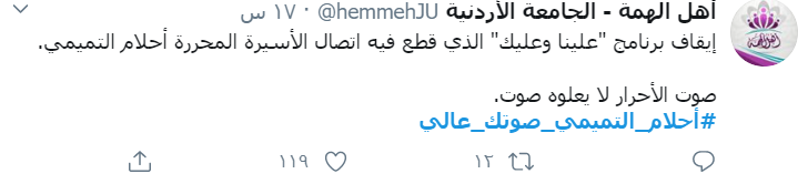 وأطلق الأردنيون عدداً من الوسوم على “تويتر” و”فيسبوك” وشبكات التواصل الاجتماعي الأخرى وسرعان ما تصدرت قوائم الأكثر تداولاً، من بينها “#أحلام_التميمي_صوتك_عالي” وذلك رداً على المذيع الذي يزعم بأن الصوت متقطع وغير مسموع، وكذلك الوسم “#كلنا_أحلام_التميمي” إضافة إلى وسوم أخرى ساخرة من قطع الاتصال ومن تبريره ومن الزعم بأن الصوت كان يتقطع.