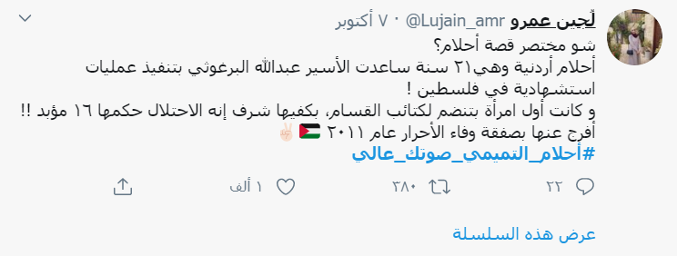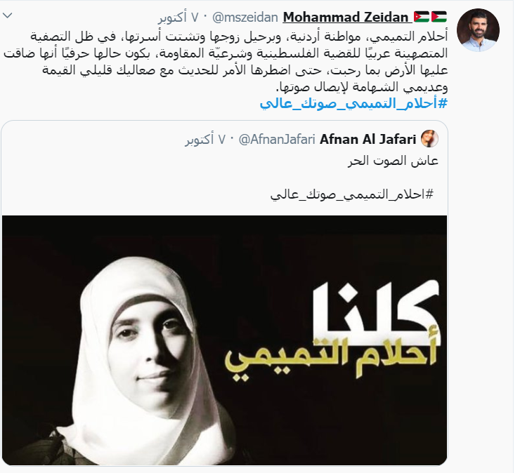 أحلام التميمي الأسيرة الأردنية المحررة من سجون الإسرائيلي، تشعل موجة غضب في الشارع الأردني بعد قرار ترحيل زوجها الأسير المحرر فلسطيني الجنسية، كما أشعلت حملة تضامن واسعة بعد انتشار مقطع فيديو تظهر فيه وهي تتحدث لإذاعة محلية أردنية عن قضيتها ثم تم قطع الاتصال معها بشكل بدا متعمداً وواضحاً.