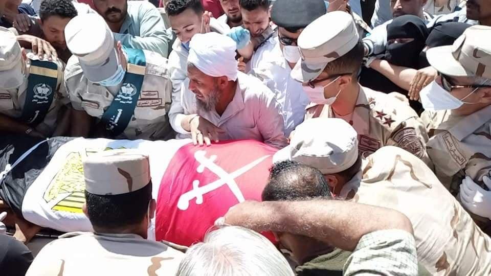 ورفع المشاركون في الجنازة صورة الشهيد ورددوا الهتافات المؤيدة للجيش والشرطة والمناهضة للإرهاب.