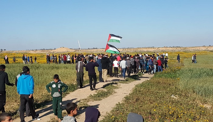 ويتظاهر آلاف الفلسطينيين منذ 30 مارس الماضي في 5 ساحات اعتصام نصبت بها خيام في محافظات القطاع بزخم كبير كل جمعة، ضمن فعاليات مسيرة العودة الكبرى.