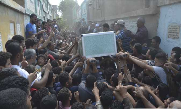 ووصل الجثمان في سيارة إسعاف يصحبها عدد من زملاء الشهيد والشرطة العسكرية، وتسابق شباب القرية على حمله للدخول للمسجد وسط زغاريد بعض النساء، وردد الشباب «الله أكبر».