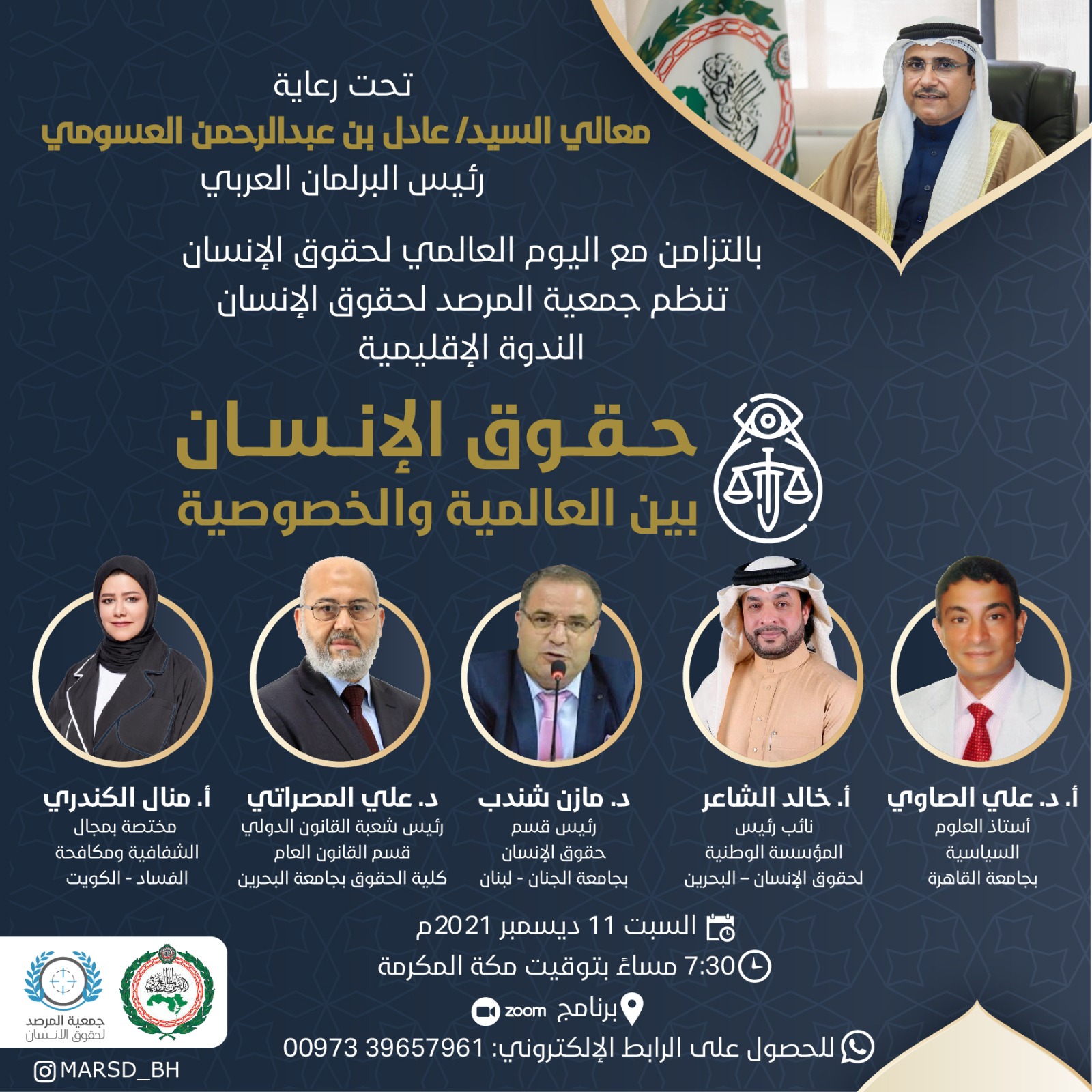 تحت رعاية وبمشاركة صاحب المعالي السيد عادل بن عبد الرحمن العسومي رئيس البرلمان العربي، تعقد جمعية المرصد لحقوق الإنسان بمملكة البحرين يوم غد السبت ندوة إقليمية تحت عنوان”حقوق الإنسان بين العالمية والخصوصية”، وذلك بالتزامن مع الاحتفال باليوم العالمي لحقوق الإنسان، وذلك تلبية للدعوة الواردة من سعادة السيد محسن الغريري رئيس جمعية المرصد لحقوق الإنسان بمملكة البحرين.