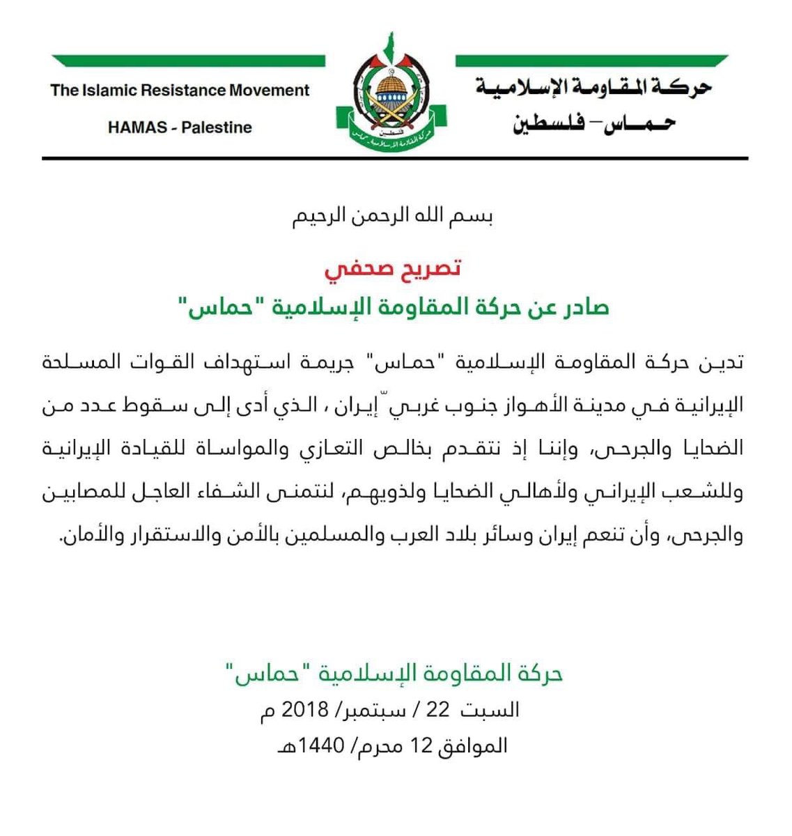 “تدين حركة المقاومة الإسلامية “حماس” جريمة استهداف القوات المسلحة الإيرانية في الأهواز”