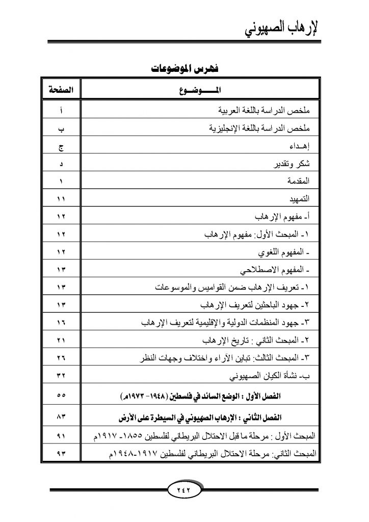 وتتكون الدراسة من مقدمة وتمهيد، وخمسة فصول، التمهيد يحدثنا عن مفهوم الإرهاب ونشأة الكيان الصهيوني، ويبدأ الصل الأول بالحديث عن الوضع السائل في فلسطين من عام 1948 إلى عام 1973، والفصل الثاني عن الإرهاب الصهيوني في السيطرة على الأرض