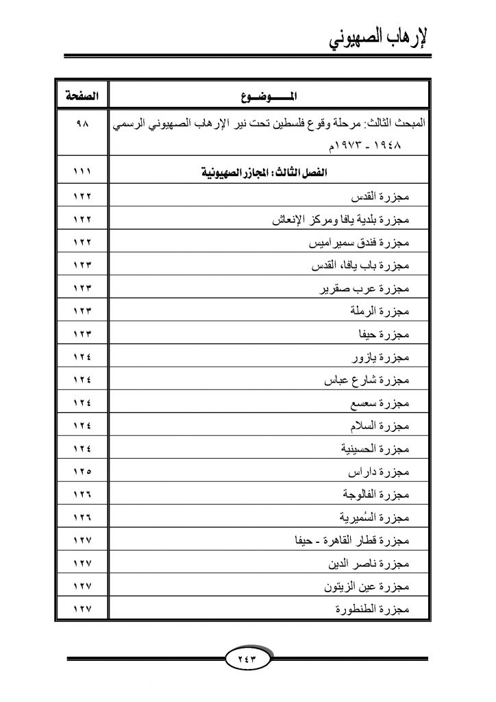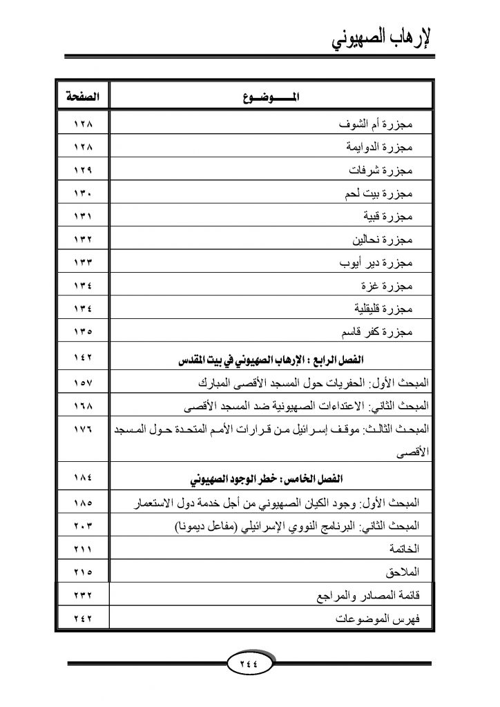 والفصل الثالث يحدثنا عن المجازر الصهيونية، والفصل الرابع عن الإرهاب الصهيوني في بيت المقدس، والفصل الخامس يسلط الضوء على خطر الوجود الصهيوني وكيف أنه يخدم دول الاستعمار