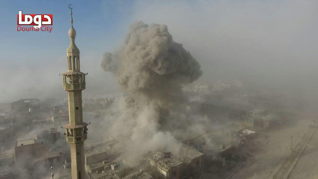مدينة  دوما في  الغوطة الشرقية ، لم يبقى مكان لا يخرج منه دخان القصف المكثف على الأحياء السكنية والتجمعات السكانية.