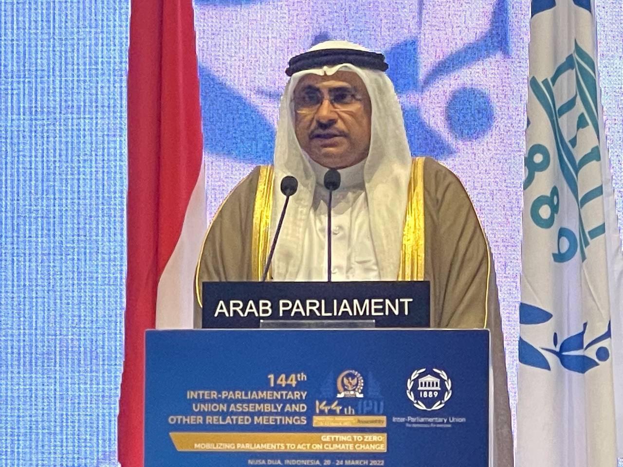 وقال العسومي، في كلمته أمام الجمعية الـ144 للاتحاد البرلماني الدولي بمدينة بالي في أندونيسيا، “لقد انتفض العالم خلال الفترة القليلة الماضية بسبب التطورات الجارية على صعيد الأزمة الروسية الأوكرانية، ونحن بالطبع لسنا مع انتهاك سيادة أي دولة أو الاعتداء عليها بأي شكل من الأشكال، لكننا نود التأكيد على أن هناك شعبا يتعرض لأبغض أشكال الاحتلال على مدار سبعة عقود مضت، هو الشعب الفلسطيني، ولم يُحرك العالم ساكنا من أجل إنهاء معاناة هذا الشعب وإقامة دولته المستقلة”.