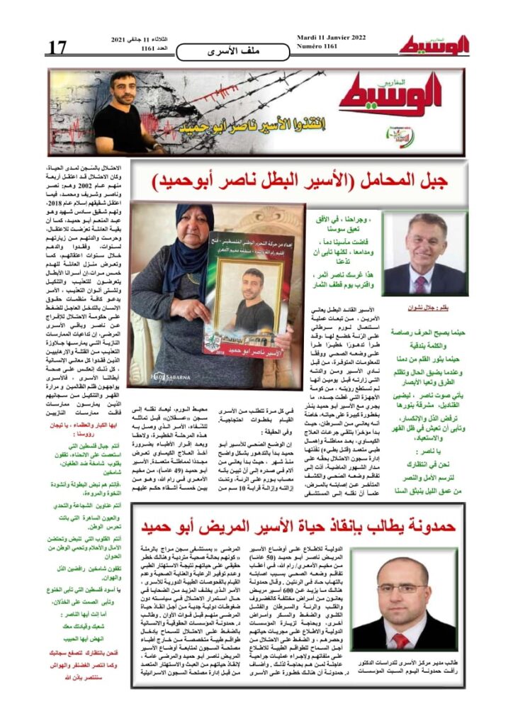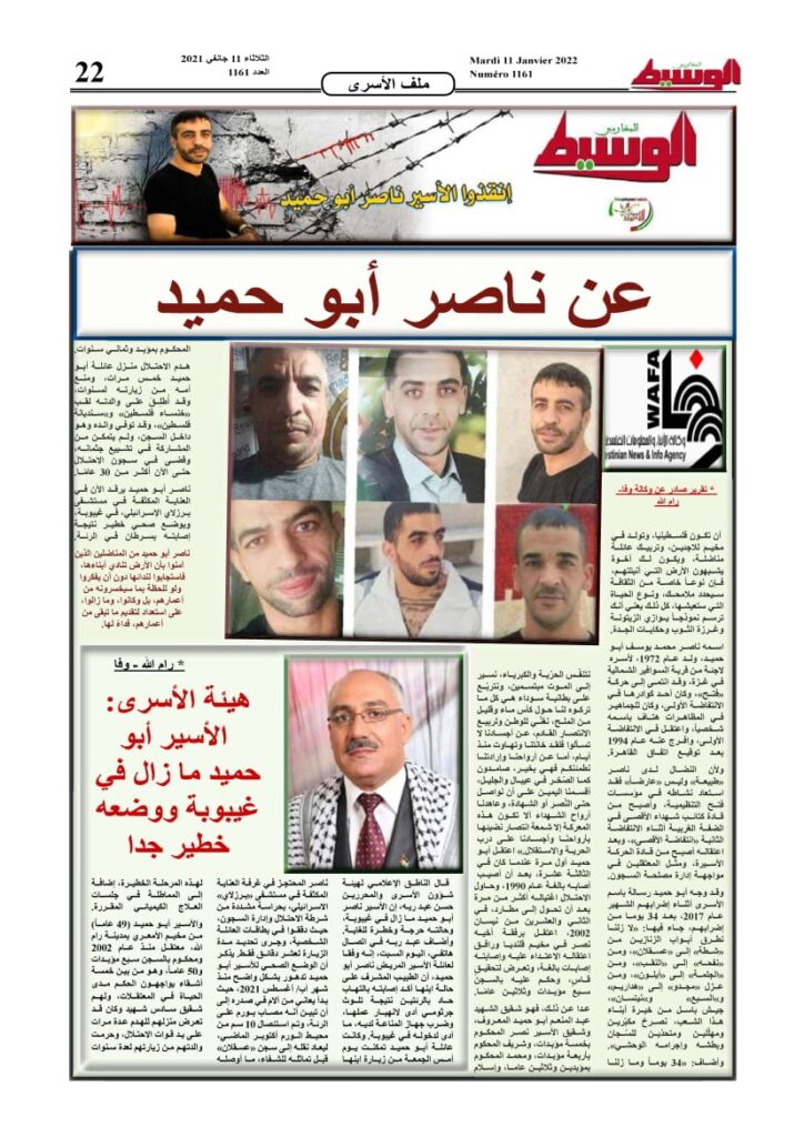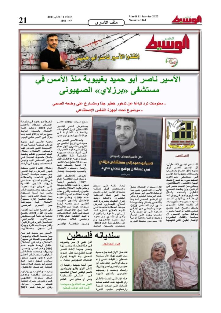 أصدرت صحيفة”الوسيط المغاربى”اليوم الثلاثاء الموافق 11/1/2022 ملحقاً خاصاً عن الأسير “ناصر أبو حميد ” والذي تتدهور حالته الصحية يوما بعد يوم إثر إصابته بالتهاب رئوي حاد أدخله في غيبوبة، وهو يرقد الآن مكبلاً فيما يسمى مشفى (برزلاي) في مدينة عسقلان ، لأنها لا تريده حياً، بل عملت، وتعمل على محاولات قتله”.