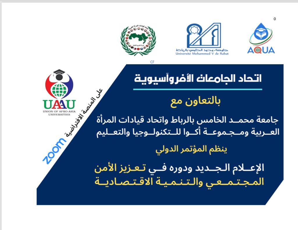 أعلن منسق عام المؤتمرات في اتحاد الجامعات الأفروأسيوية، والناطق الرسمي للمؤتمر الدولي “قضايا الإعلام الجديد” محمد عبد العزيز عن إنطلاق فعاليات المؤتمر الدولي “الإعلام الجديد ودوره في تعزيز الأمن المحتمعي والتنمية الاقتصادية” مساء غد الأحد ، الذي ينظمه اتحاد الجامعات الأفروآسيوية بالتعاون مع جامعة محمد الخامس ممثلة في كلية العلوم القانونية واتحاد قيادات المرأة العربية، ومجموعة أكوا للتكنولوجيا والتعليم.