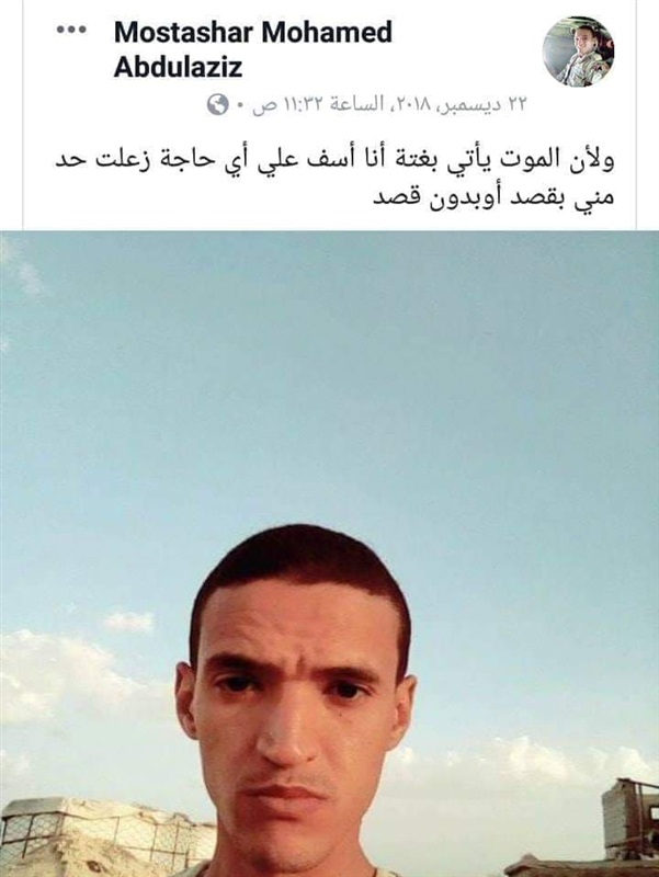 يذكر أن آخر ما كتبه الشهيد على صفحته الشخصية كان: “لأن الموت يأتى بغتة انا اسف على اى حاجة زعلت منى حد بقصد أو بدون قصد”، والشهيد يبلغ من العمر 25 عاما، خريج كلية الشريعة والقانون.