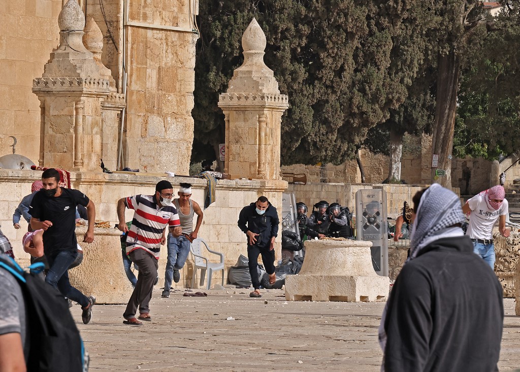 Palestinians run for cover amid clashes with Israeli security forces at Jerusalem’s Al-Aqsa mosque compound on May 10, 2021, ahead of a planned march to commemorate Israel’s takeover of Jerusalem in the 1967 Six-Day War. (Photo by ahmad gharabli / AFP)