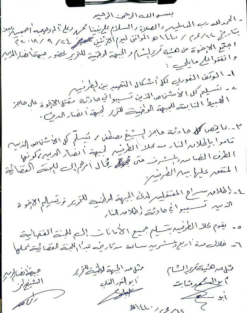 مستند.. نص الاتفاق بين الجبهةالوطنية للتحرير و هيئة تحرير الشام