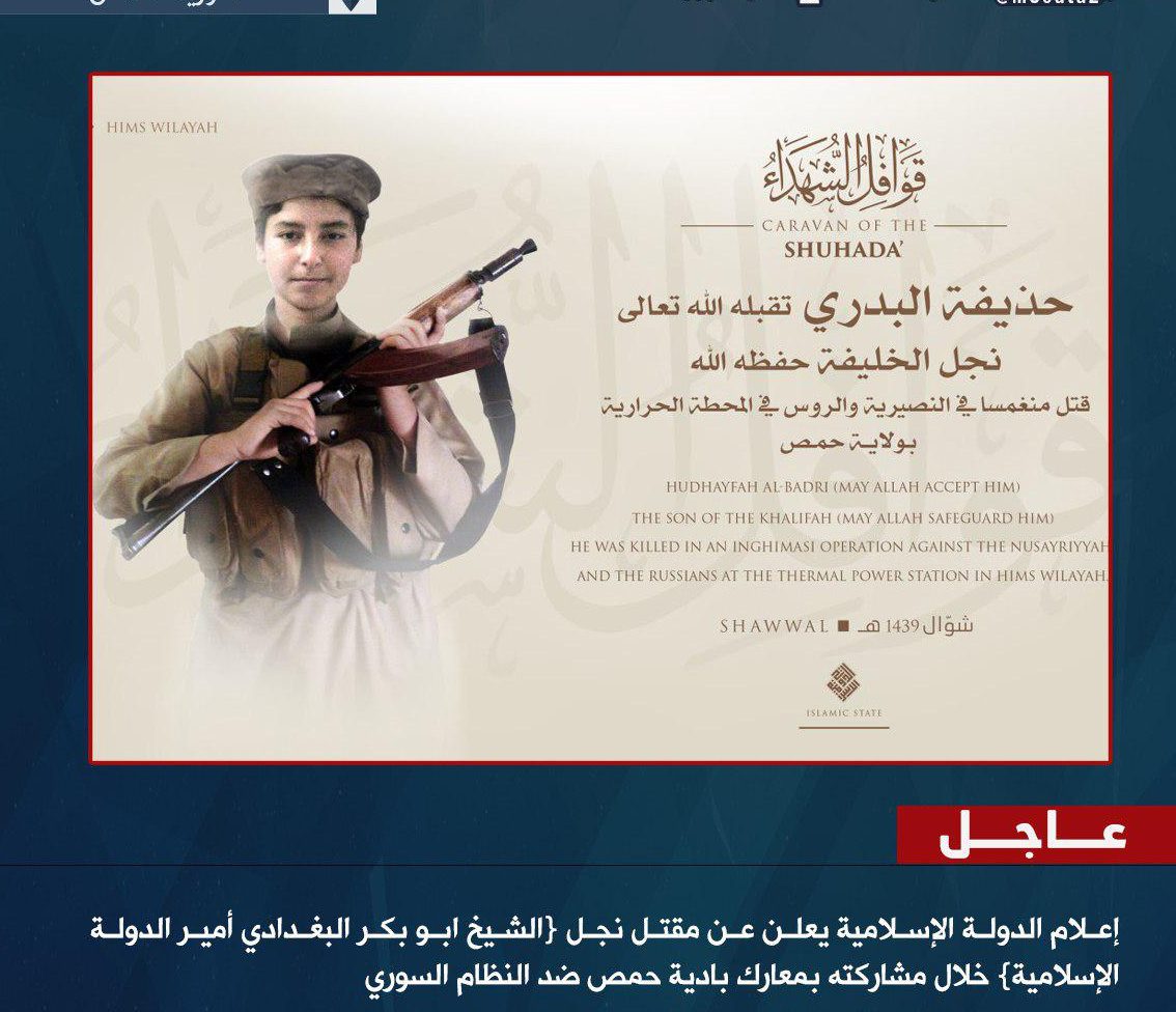 وقالت وكالة ناشر نيوز في بيان لها أن” حذيفة البدري نجل أبو بكر البغدادي زعيم التنظيم قُتل في معارك مع قوات النظام السوري والقوات الروسية في المحطة الحرارية بولاية حمص”.