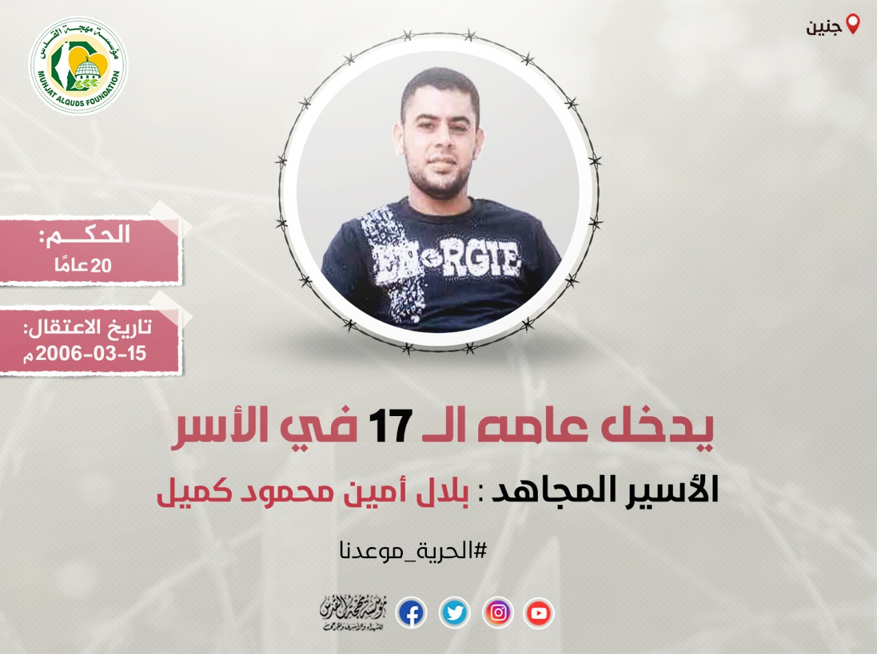 أفادت مؤسسة مهجة القدس للشهداء والأسرى والجرحى؛ أن الأسير المجاهد بلال أمين محمود كميل (44 عامًا) من بلدة قباطية بمحافظة…