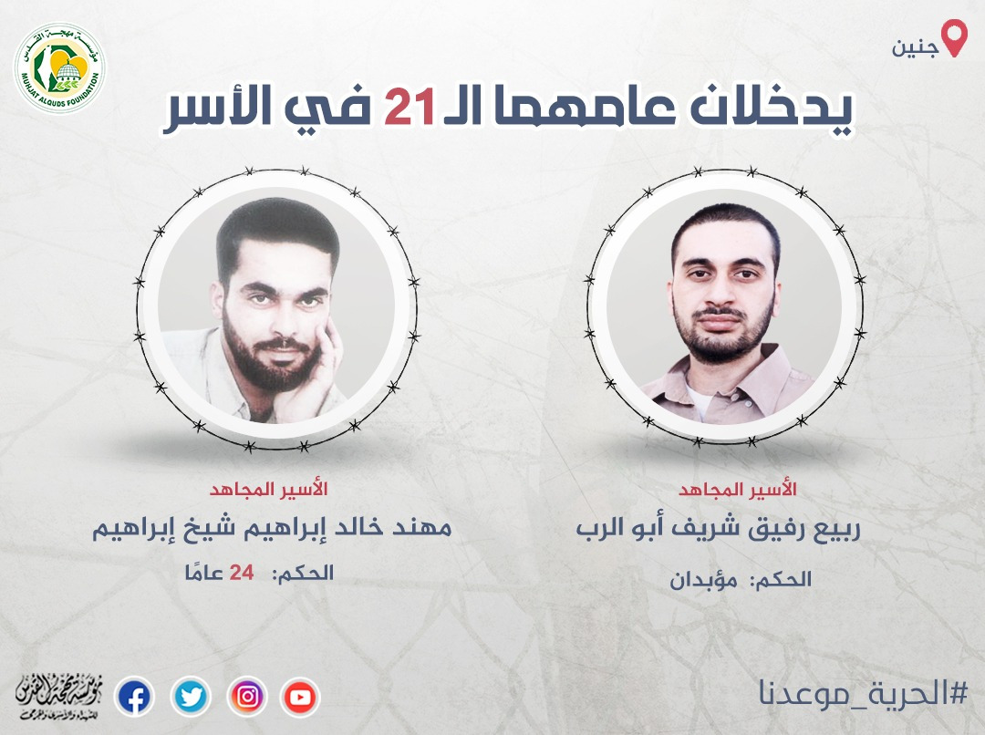 أفادت مؤسسة مهجة القدس للشهداء والأسرى والجرحى أن الأسيران المجاهدان مهند خالد إبراهيم شيخ إبراهيم (43 عامًا) وربيع رفيق شريف…
